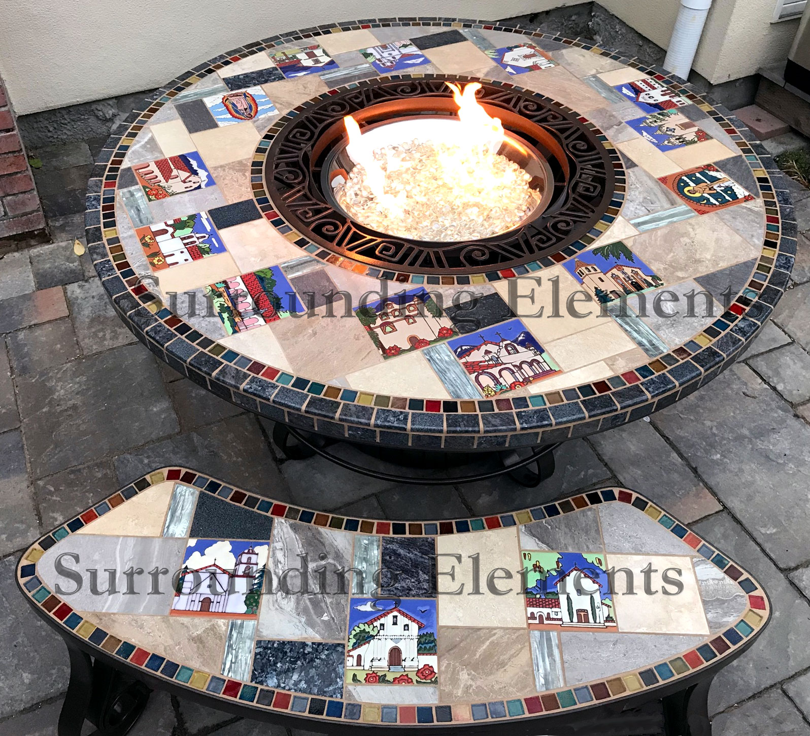 5′ Round Leg Warmer Table with Ornate Ring and Crystal Fire. Shown with Matching Bench Mission Design