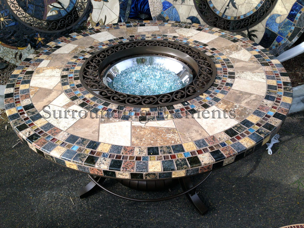 5′ Round Leg Warmer Table with Ornate Trim Ring and Crystal Fire Burner. Mediterranean Design