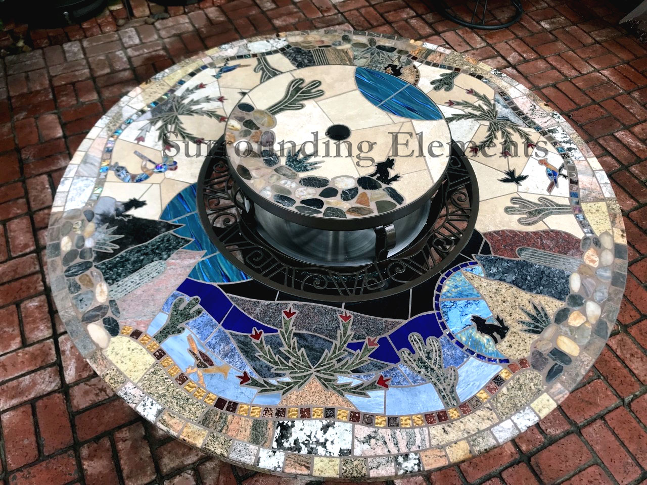 5′ Round Legwarmer Table in a Desert Design. Shown with Center Plug, Lazy Susan, Crystal Fire Burner and Ice Bucket
