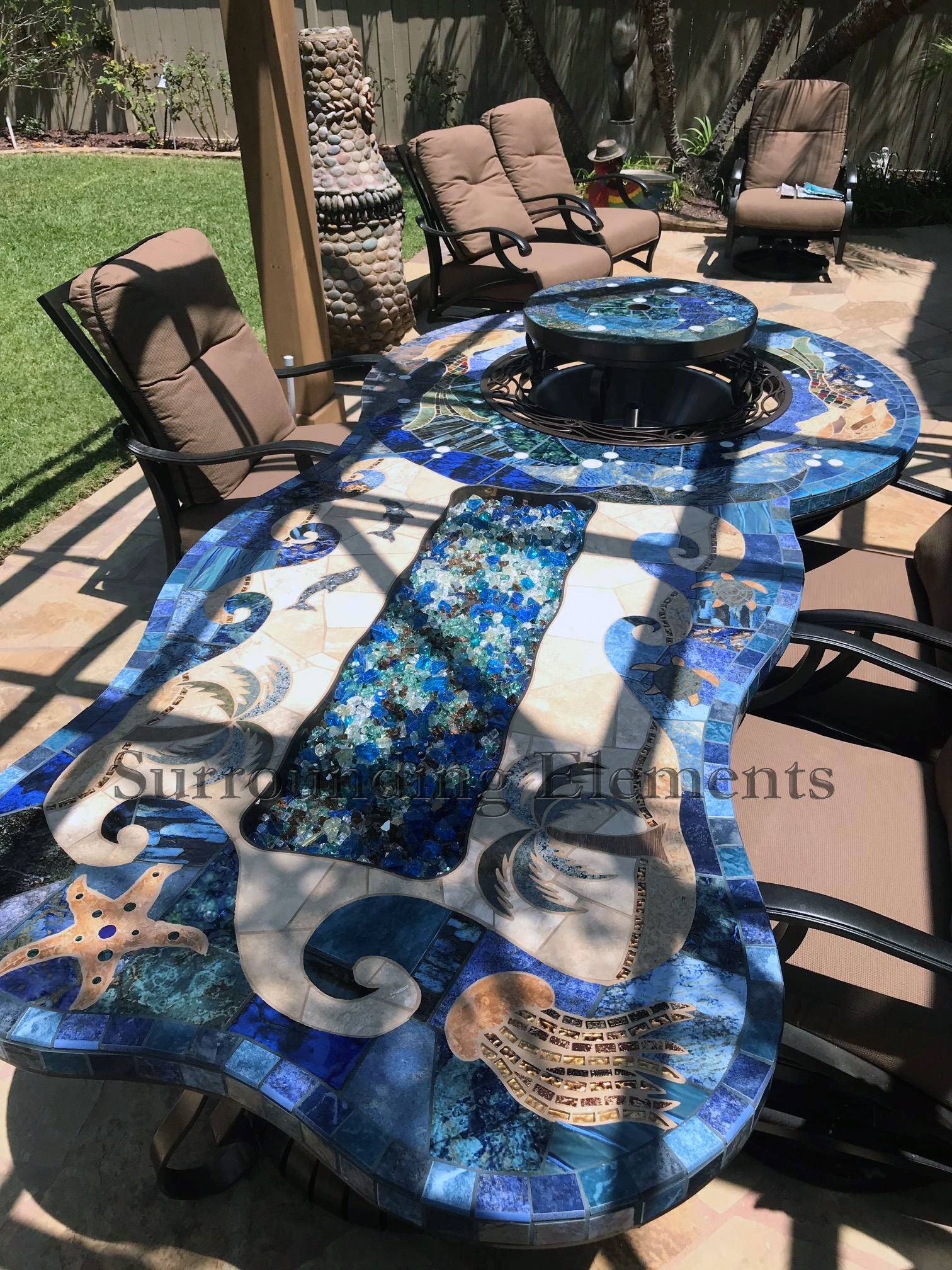 Custom Shaped Table in a Sea Life Design Shown with Center Plug, Lazy Susan Stand and Glass Burner