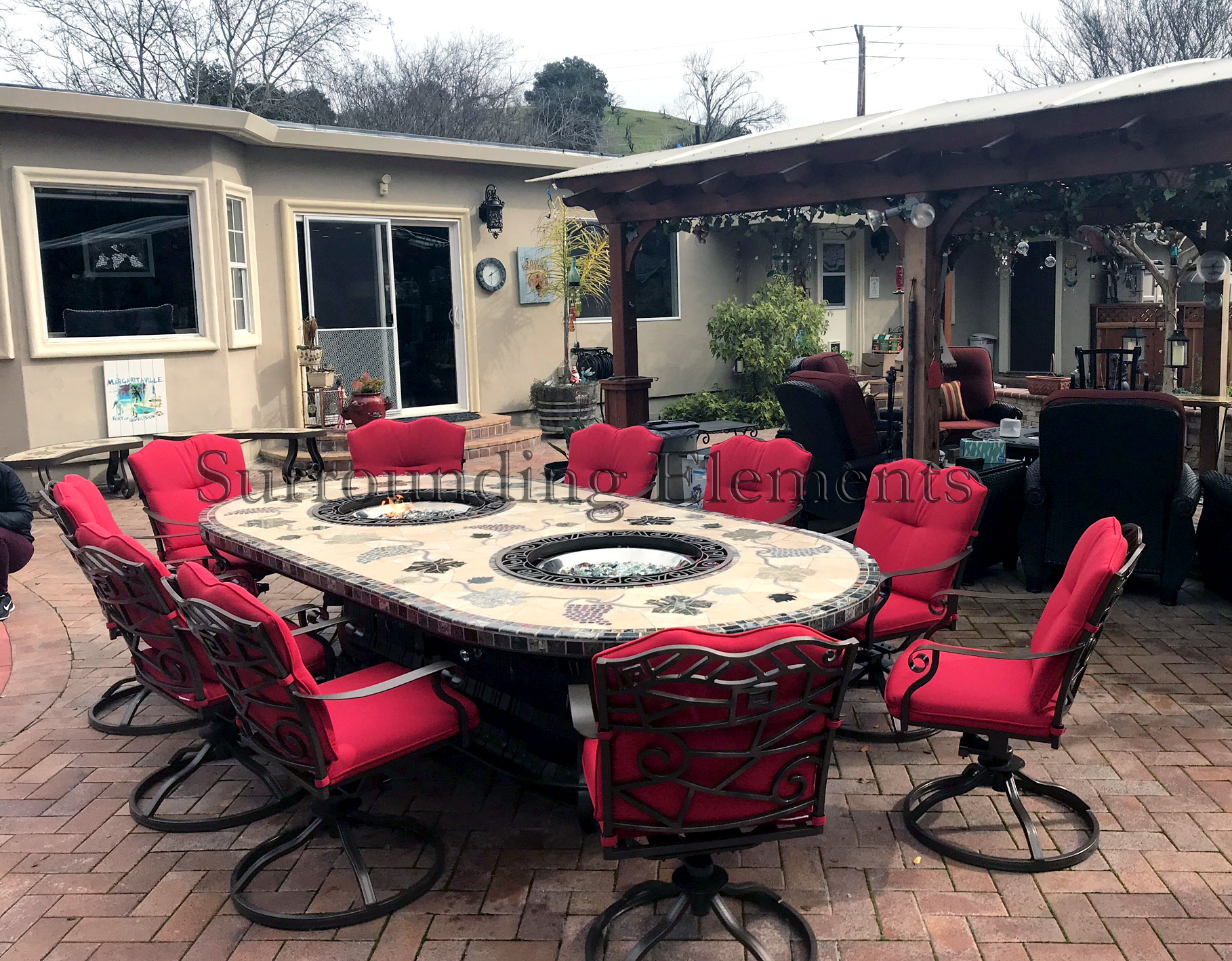 Double Pit Oval Leg Warmer Table in Grape Design Shown with Crystal Fire Burners and Ornate Rings