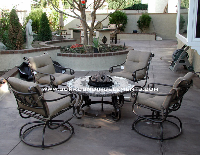 Firepit Table, Broken Mosaic Design with 4 chairs. (BBQ Island, Full Table & Side Stand in Background)