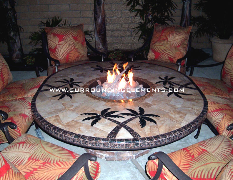 Firepit Table, Palm Tree Design on Brick Base with 4 Chairs and 2 Loveseats