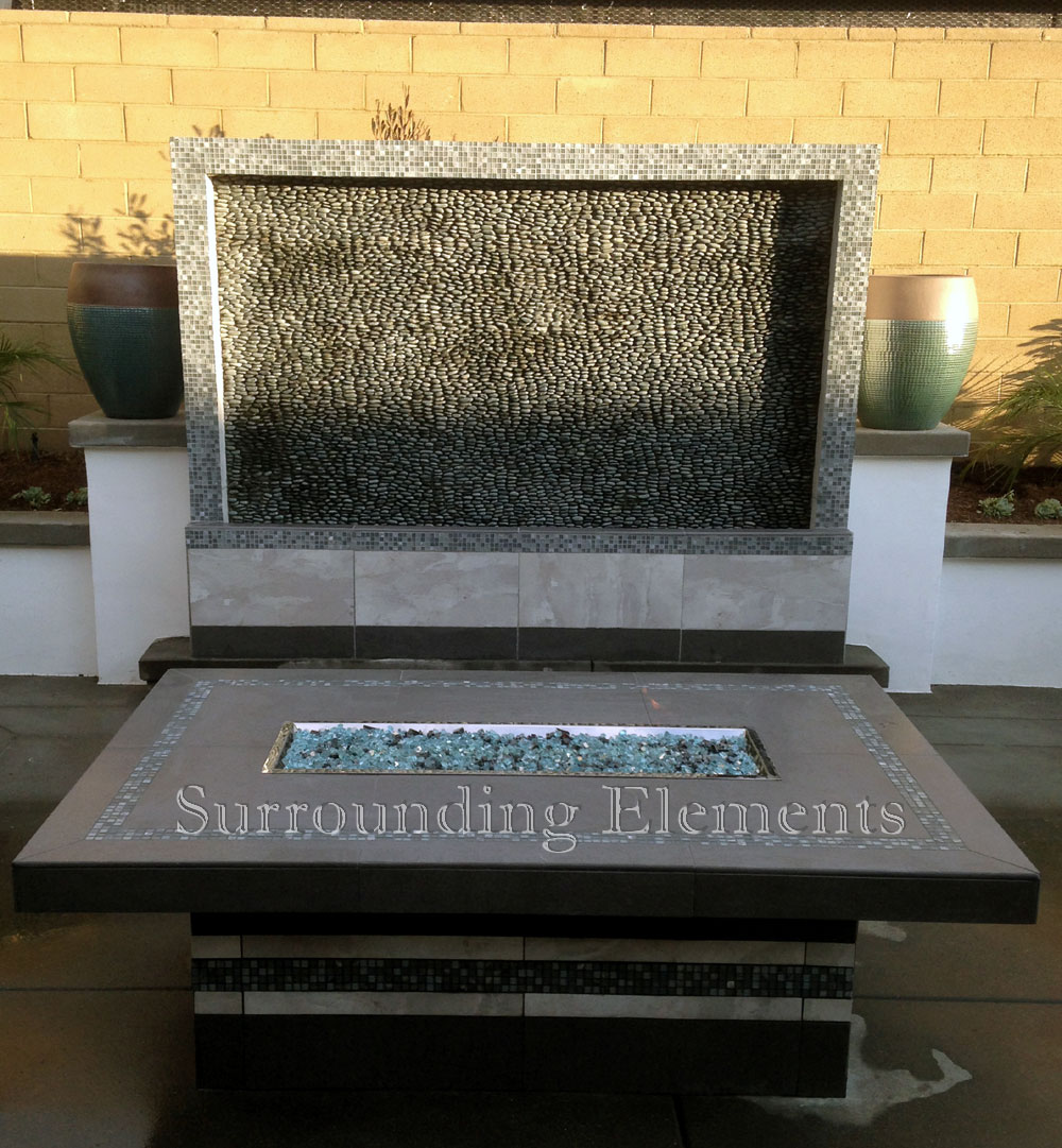 Rectangle Coffee Table with Crystal Fire Burner. Cascading Fountain shown in background
