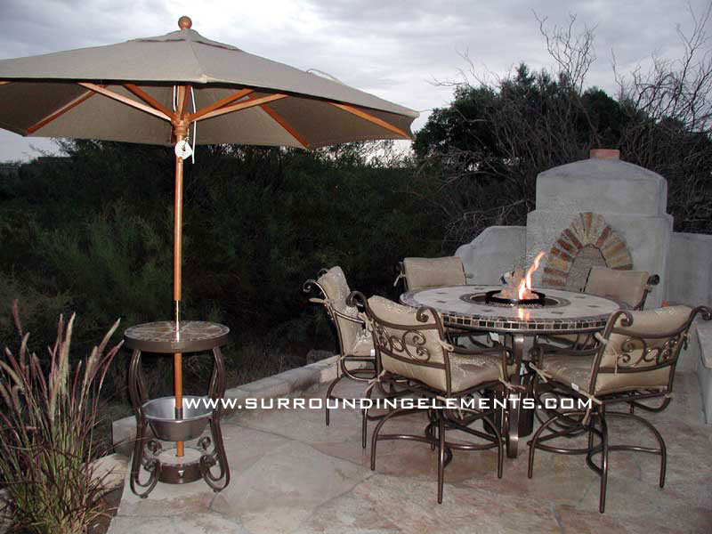 Round Table, Mediterranean Design with Fire Logs and Side Stand with Umbrella and Ice Bucket