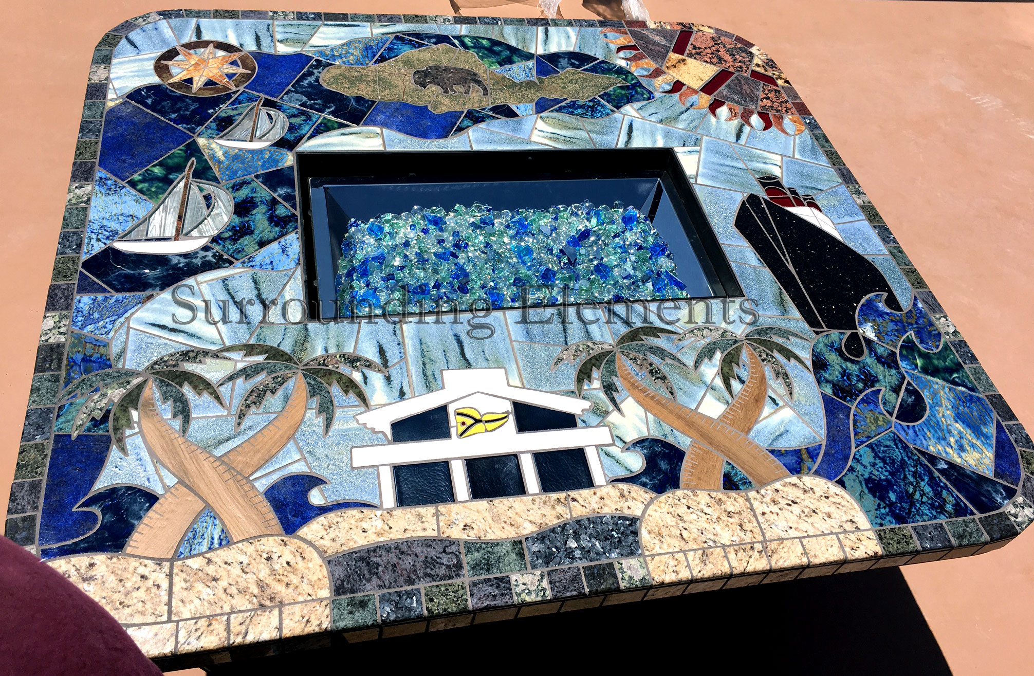Square Firepit Table in a Marine Design. Shown with Rectangle Crystal Fire Burner